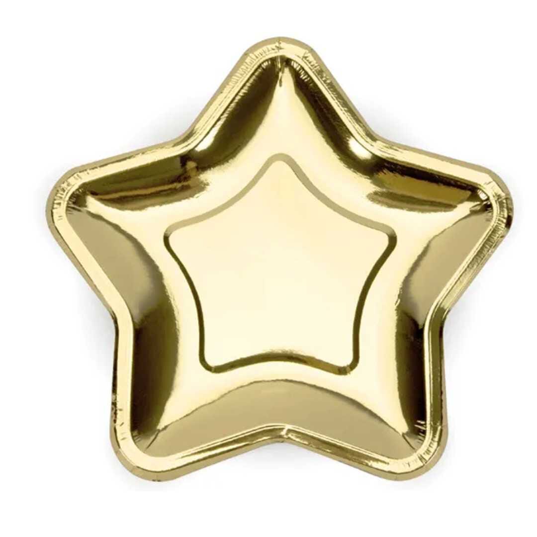 Добавете блясък и празнична елегантност към вашата маса с тези стилни златни хартиени чинии във форма на звезда. Те са перфектен избор за Коледа, Нова година, рожден ден, зимни партита и тематични празненства, като придават завършен и луксозен вид на всяка декорация.