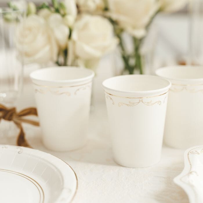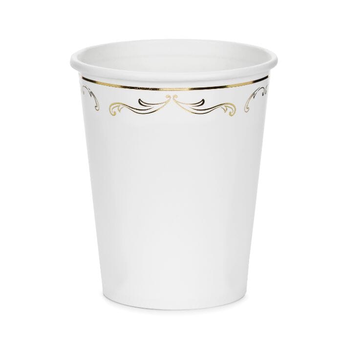 Добавете елегантен и изискан акцент към празничната маса с тези парти чаши със златен орнамент в бял цвят. Деликатният декоративен мотив придава стилна визия и ги прави подходящи за различни поводи – рожден ден, бебешко парти, кръщене или празнично събиране.