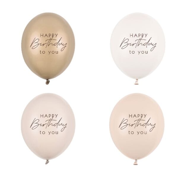 Създайте елегантна и стилна атмосфера за рожден ден с тези висококачествени латексови балони в бежова гама и надпис "Happy Birthday to you". Идеални за декорация на детски партита, юбилеи, тематични празненства и фотозони.