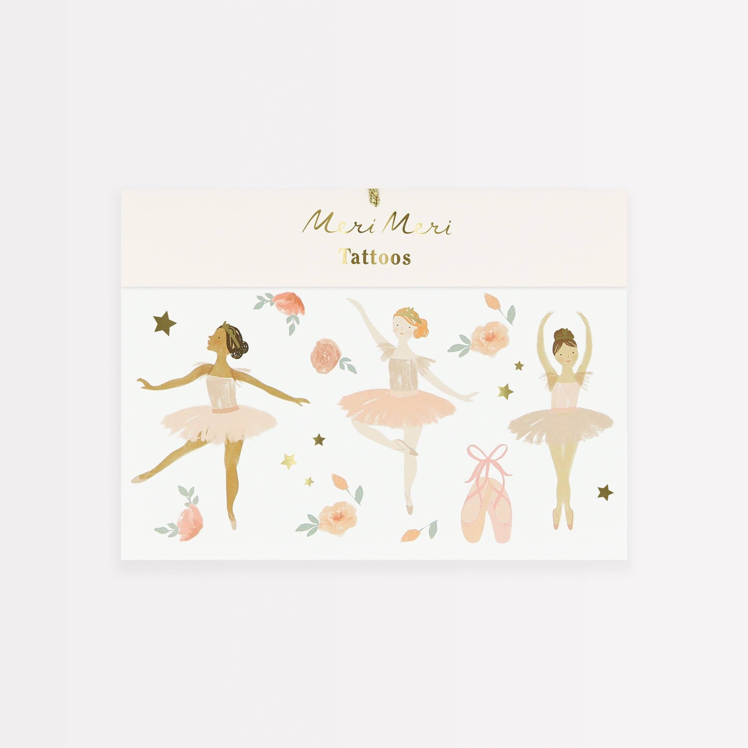 Танцувайте мечтателно с временните татуировки „Балерина“! Този комплект от 29 временни татуировки, декорирани с нежни пастелни розови нюанси и блестящи детайли от златно фолио, е идеален за балетно парти, като занимание или за парти чанти.