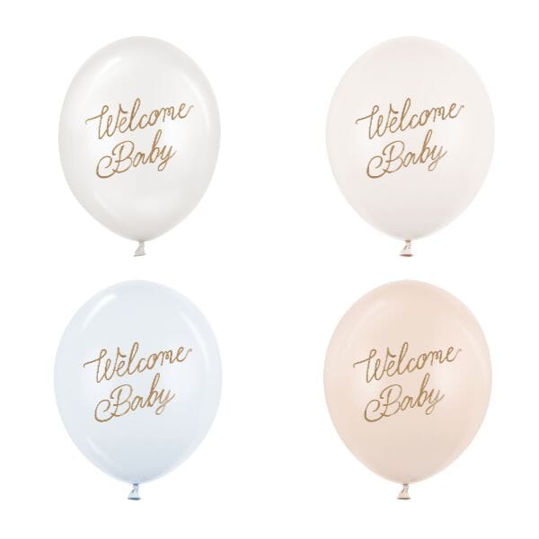 • Специален дизайн – балоните са с нежен принт „Welcome Baby“ в златно, върху пастелни нюанси от: бял металик, екрю, светло синьо и пастелено бежаво