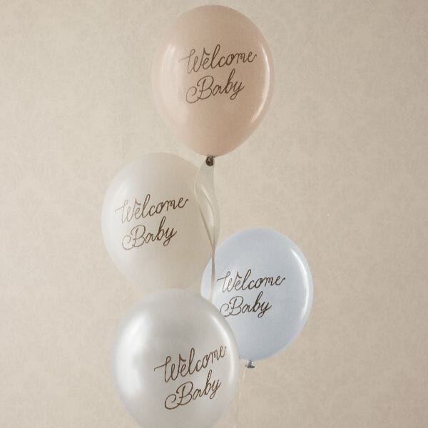 Специален дизайн – балоните са с нежен принт „Welcome Baby“ в златно, върху пастелни нюанси от: бял металик, екрю, светло синьо и пастелено бежаво