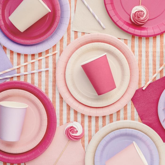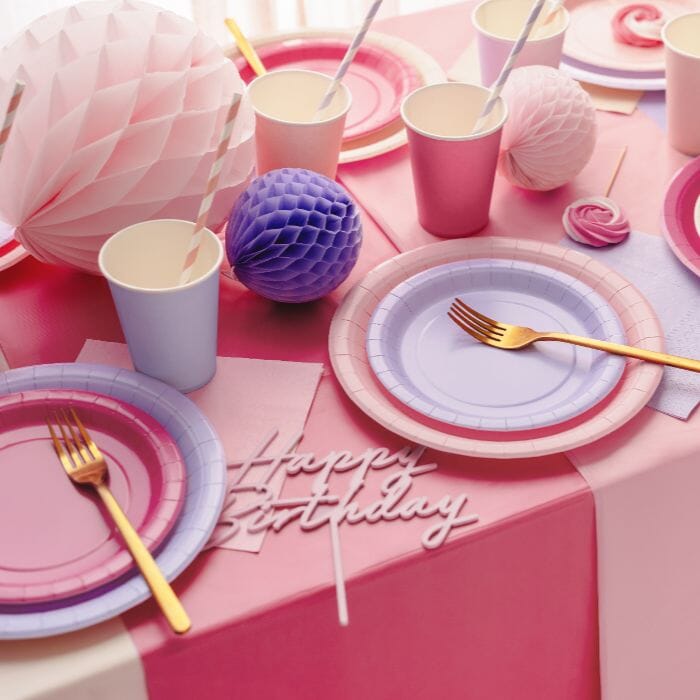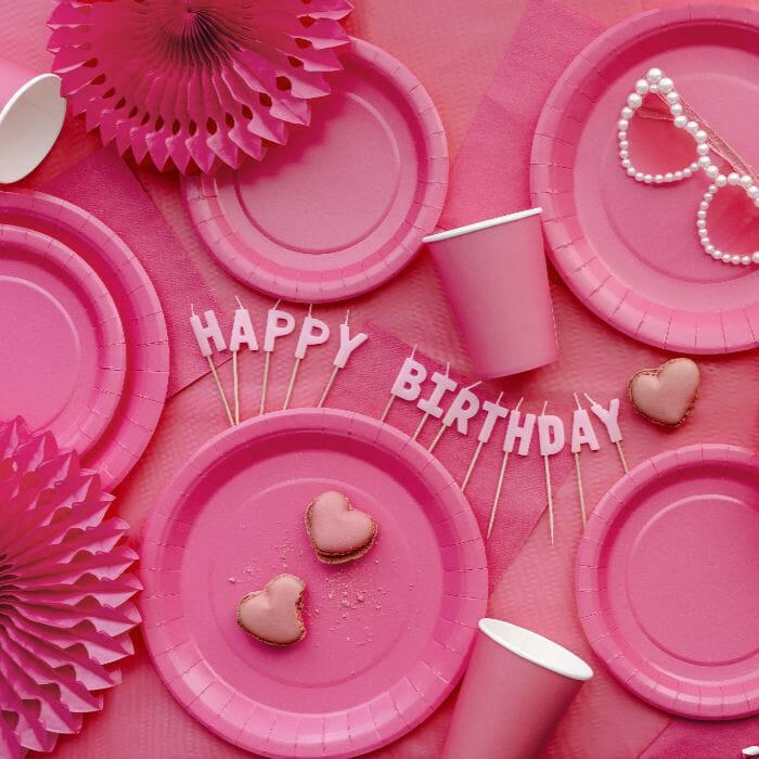 Добавете цвят и забавна атмосфера на вашата трапеза с тези тъмно розови чинии, които са идеални за момичешко парти. Те създават елегантна и модерна визия, подходяща и за рождени дни, бебешко парти или други специални поводи.